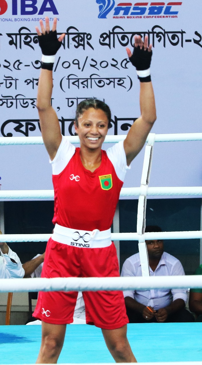 আজ বৃহস্পতিবার মোহাম্মদ আলী বক্সিং স্টেডিয়ামে অনুষ্ঠিত জাতীয় বক্সিং চ্যাম্পিয়নশিপে মেয়েদের ৫২ কেজি ওজন শ্রেনীতে তিন রাউন্ডের সবকটিতেই আনসারের আফরাকে হারিয়ে স্বর্ণপদক জিতে নেন প্রথমবার খেলতে আসা নরসিংদী গুডউইল বক্সিং ক্লাবের জিনাত ফেরদৌস।